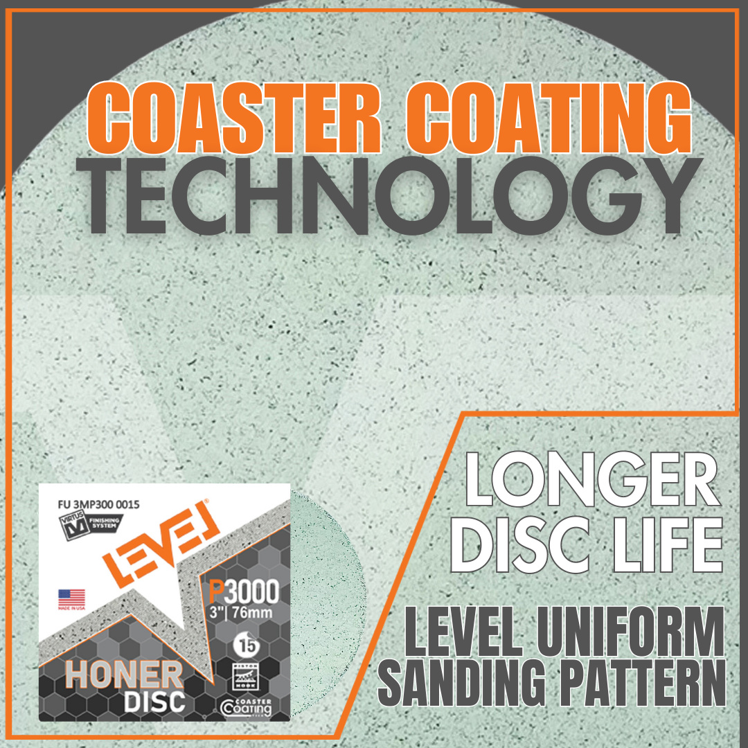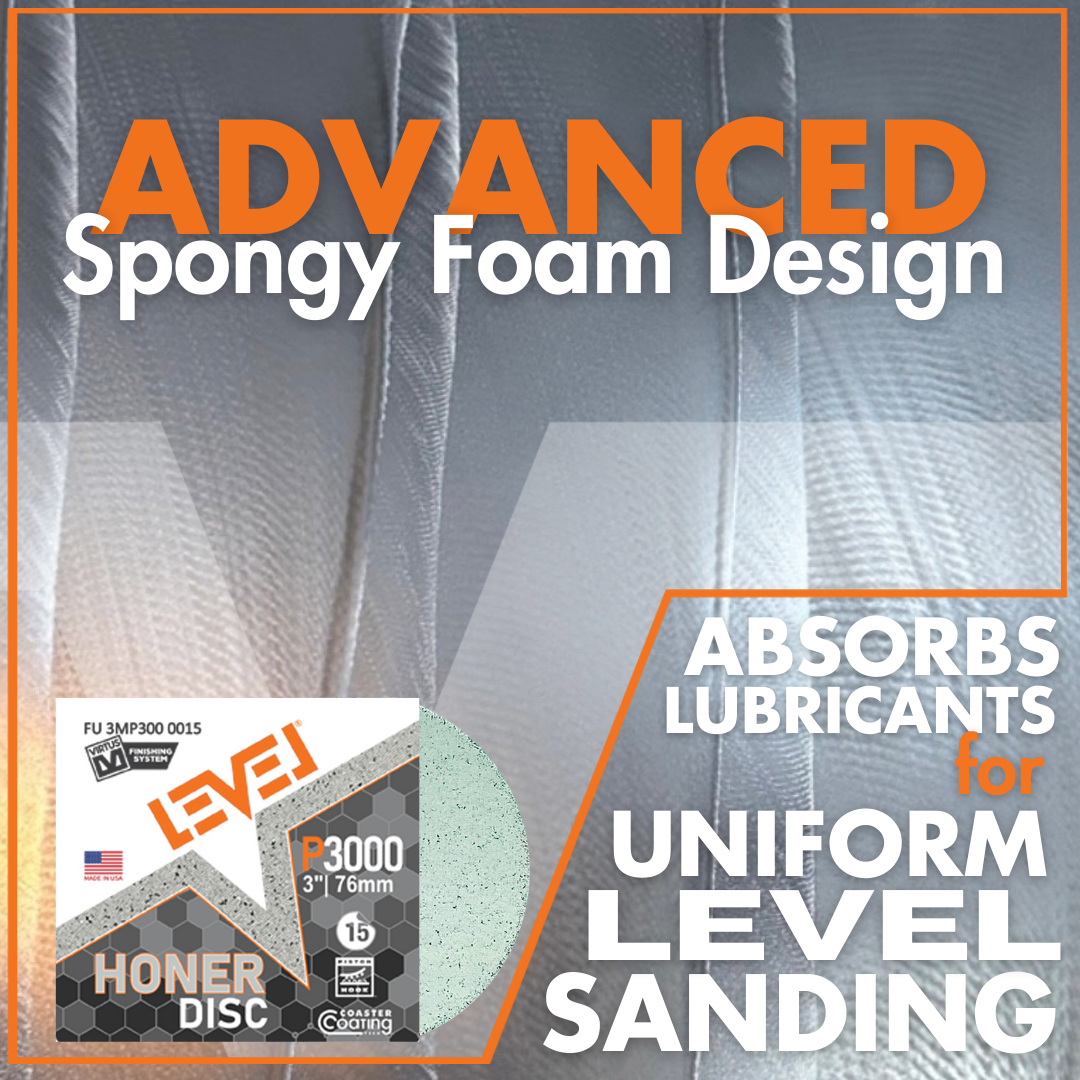 Honer Disc's spongy foam absorbs lubricants that allows it to maintain a unform sanding pattern and a comfortable feel while sanding. This enables the user greater precision and more efficient leveling process. Honer Discs Coaster Coating Technology, longer disc life, more even, uniform sanding and leveling advantages sets it well above the competition. These advantages also make LEVEL Honer Discs Honer more cost effective to help every body shop more profitable. Increase sanding refinement by using LEVEL Liquid Leveler sanding polish and sanding lubricant.