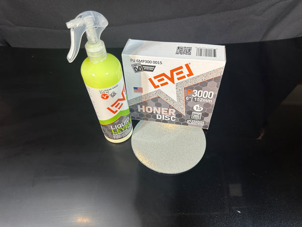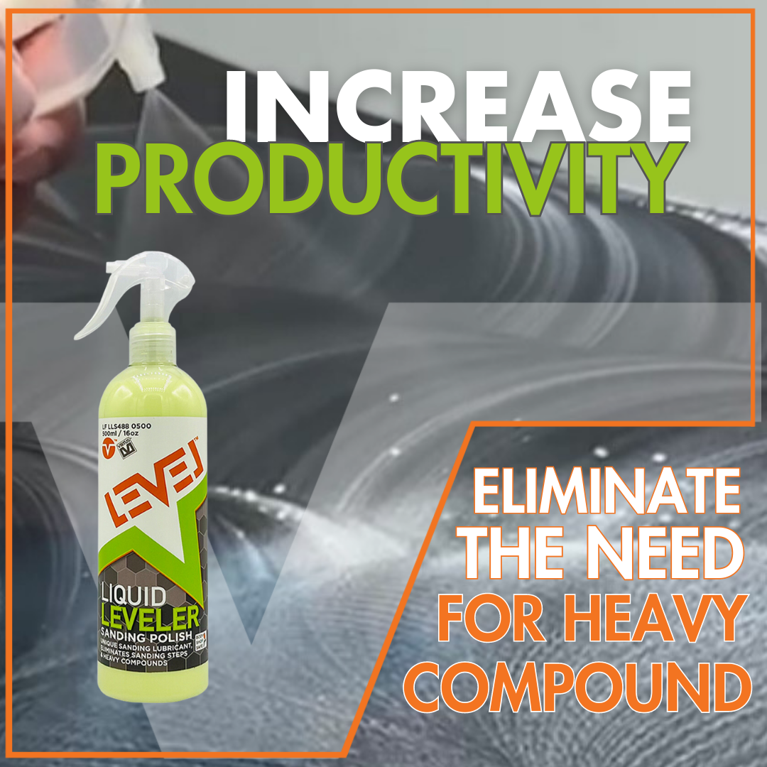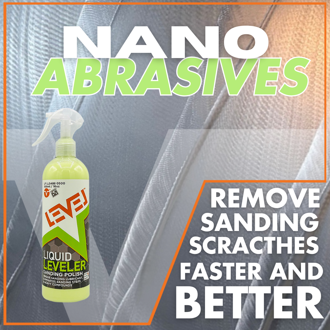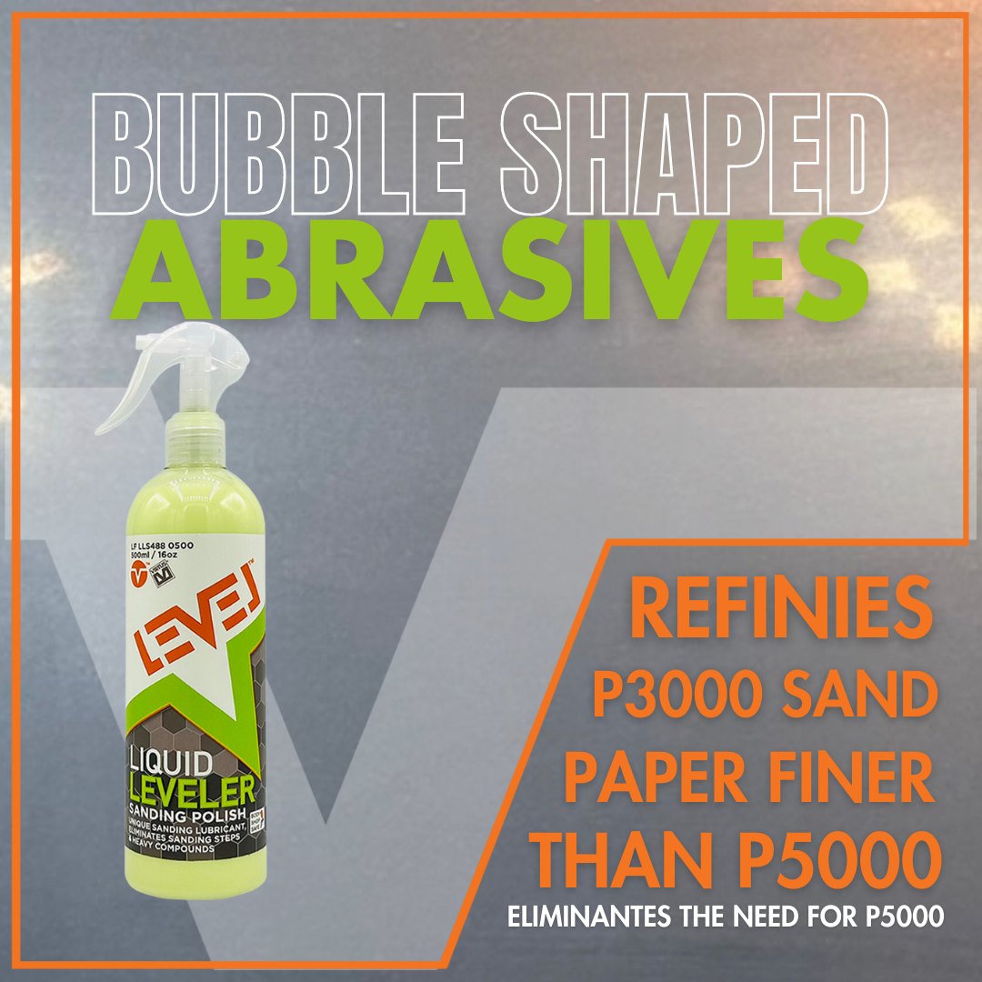 LIQUID LEVELER is a unique sanding lubricant with the added strength of NANO abrasives. These tiny bubble-shaped abrasives assist in the refining process and increase sanding performance during the p3000 wet sanding step to refine the sand and eliminates the need for p5000 sanding or higher and the need for heavy rubbing compounds. Liquid Leveler increases your productivity by eliminating sanding steps and the need for heavy rubbing compounds.