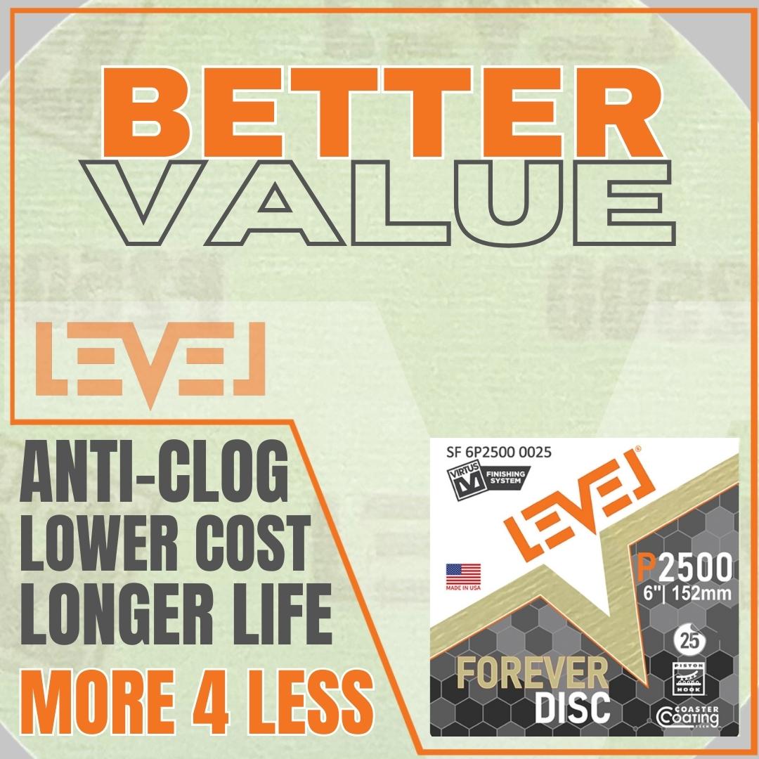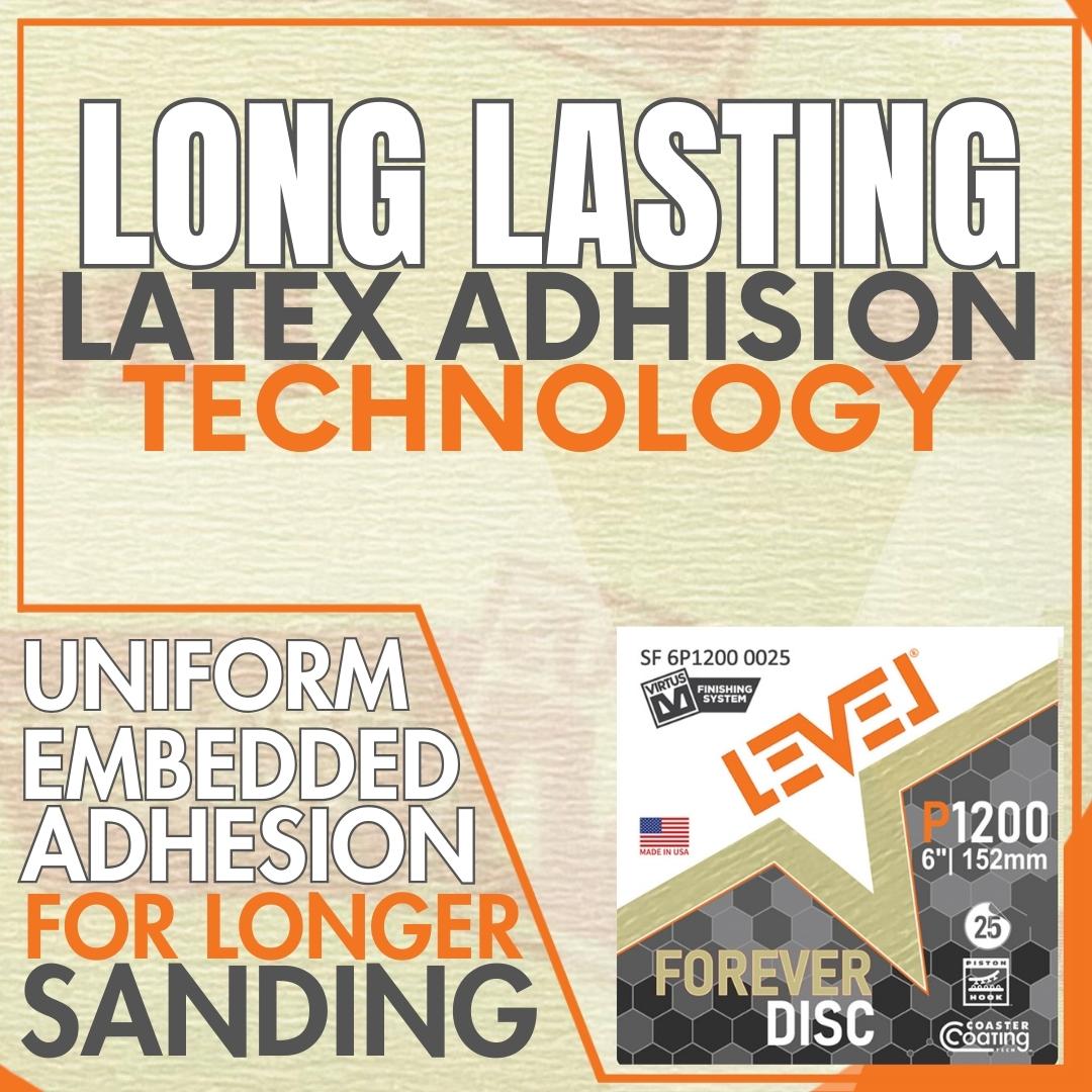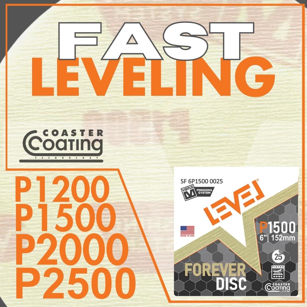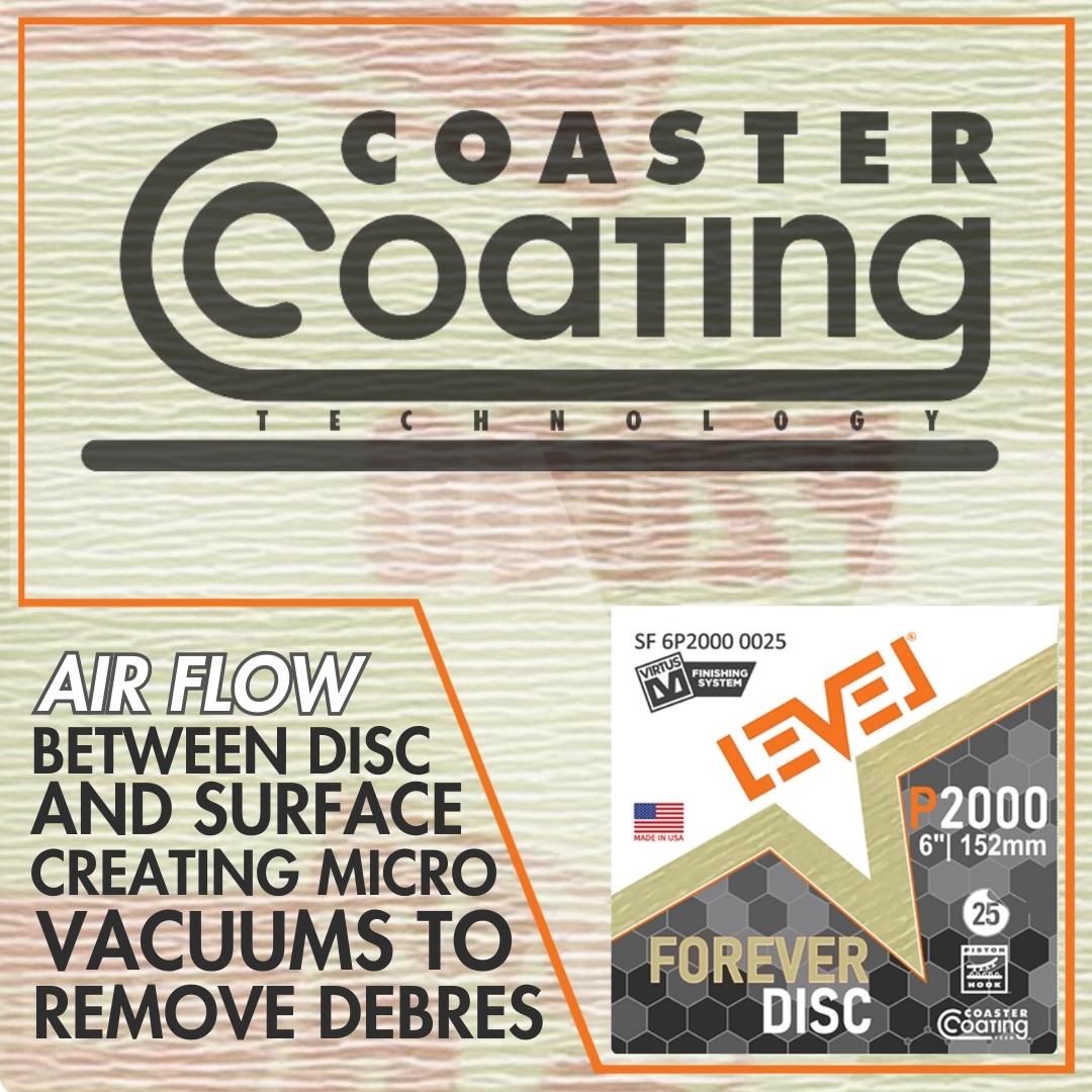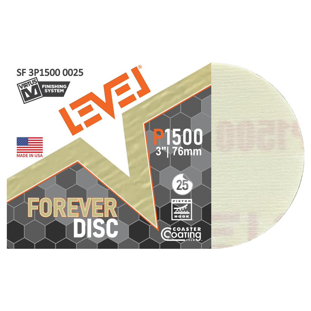 FOREVER DISCS FOREVER Disc non-stick COASTER COATING, dry-lubricant technology provides the fastest cut possible with the most consistently refined finish. The diamond-like waves evenly cut surfaces with microreplication. Coaster Coating Technology allows air to flow between the disc and surface creating micro-vacuums to flush out debris. Next-Generation FOREVER DISC abrasives are embedded into a latex backing to reduce friction. Less friction combined with the diamond-like wave design reduces the clogging up of sanded debris. This innovative design creates the fastest, most effective, LEVEL finish and extends the life of FOREVER DISCS 2 to 3 times longer than comparable discs. When combined with our “Piston Hook” interface pads, this specialized sanding system will shorten both sanding steps and buffing times while increasing productivity and quality! Available in 3” & 6” sizes and p1200, p2000, p2500 grits.