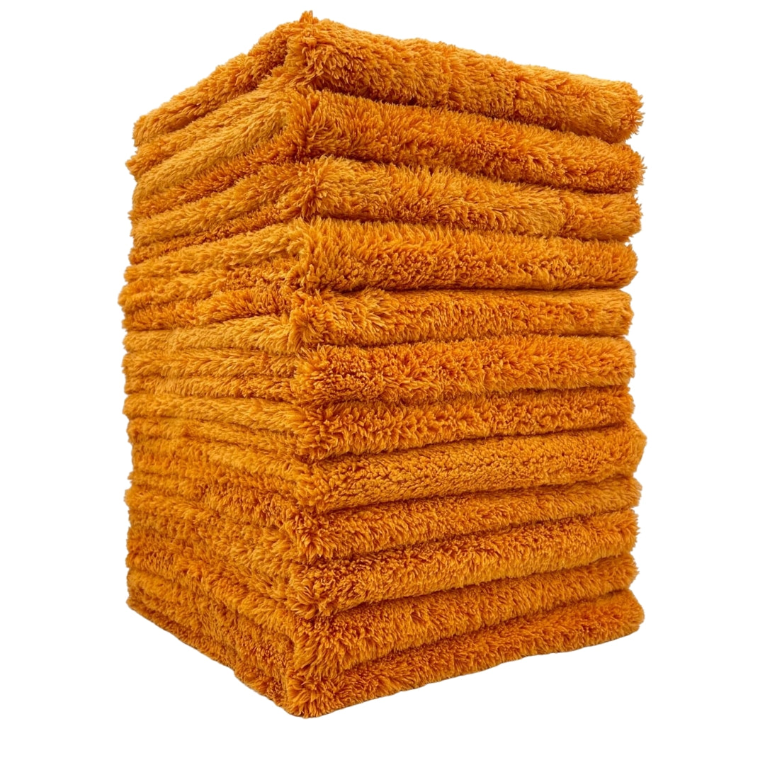 These 500 GSM terry weave microfiber cleaning towels measure 16 by 16 inches. Now with ultrasonic cut, meaning no surged edges on the towels, resulting in smoother and more efficient cleaning and drying. The towels maintain their shape with perfect square corners. Automotive detailers and enthusiasts will be happy to know that there are no labels sewn on these towels, so no risk to scratch the paint. These ultrasoft microfiber towels will leave a clean, dry, and polished surface. Soft cloths are safe to use on all surfaces around the home, car, RV, motorcycle, aircraft or boat. In addition, these microfiber towels are especially adept at cleaning without the use of chemicals. Use them dry, and they will work like magic without scratching, linting or streaking. Use them wet and they will absorb seven to eight times their own weight in water. Due to their superior quality, these microfiber towels can be washed and reused hundreds of times. Care instructions: Machine wash. Tumble dry low, and do not iron. Do not use fabric softener as this would clog the microfibers and reduce performance. Do not use chlorine bleach. Wash with other non-linting materials to maintain proper dirt-gripping properties.